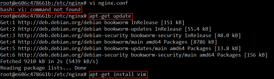 vi 명령어를 통해 수정하려 했으나 컨테이너에 vim 이 설치되어 있지 않아서 apt-get update 명령어로 패키지를 업데이트 하고 apt-get install vim 명령어로 vim 에디터를 설치해준다.