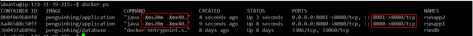 똑같은 조건의 애플리케이션 컨테이너를 두 개 띄운다. 이때 포트는 각각 8080, 8081 로 해주었다.
