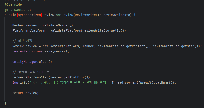 리뷰를 작성하는 메서드이다. 이것도 refreshPlatformStar() 를 호출하여 플랫폼의 평점을 업데이트한다.