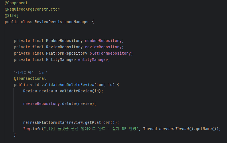 리뷰를 삭제하는 메서드이다. 삭제하고 난 뒤 refreshPlatformStar() 메서드를 호출하여 플랫폼의 평점을 업데이트한다.