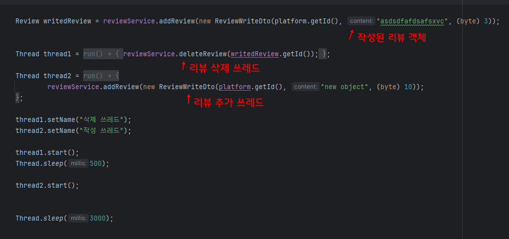 (여기서 왜 삭제 쓰레드와 작성 쓰레드가 가져온 리뷰 갯수가 다른지 궁금할 수 있는데, 이는 스프링에서 제공하는 @Transactional 과 JPA 에 대한 이해가 필요하다. 본 게시물 주제와 벗어나는 내용이므로 다루진 않는다.)