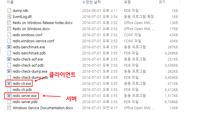 그럼 이런 파일들이 보일텐데, 우리는 Redis 서버를 먼저 열어주어야 하기 때문에 서버 파일을 실행시켜준다.