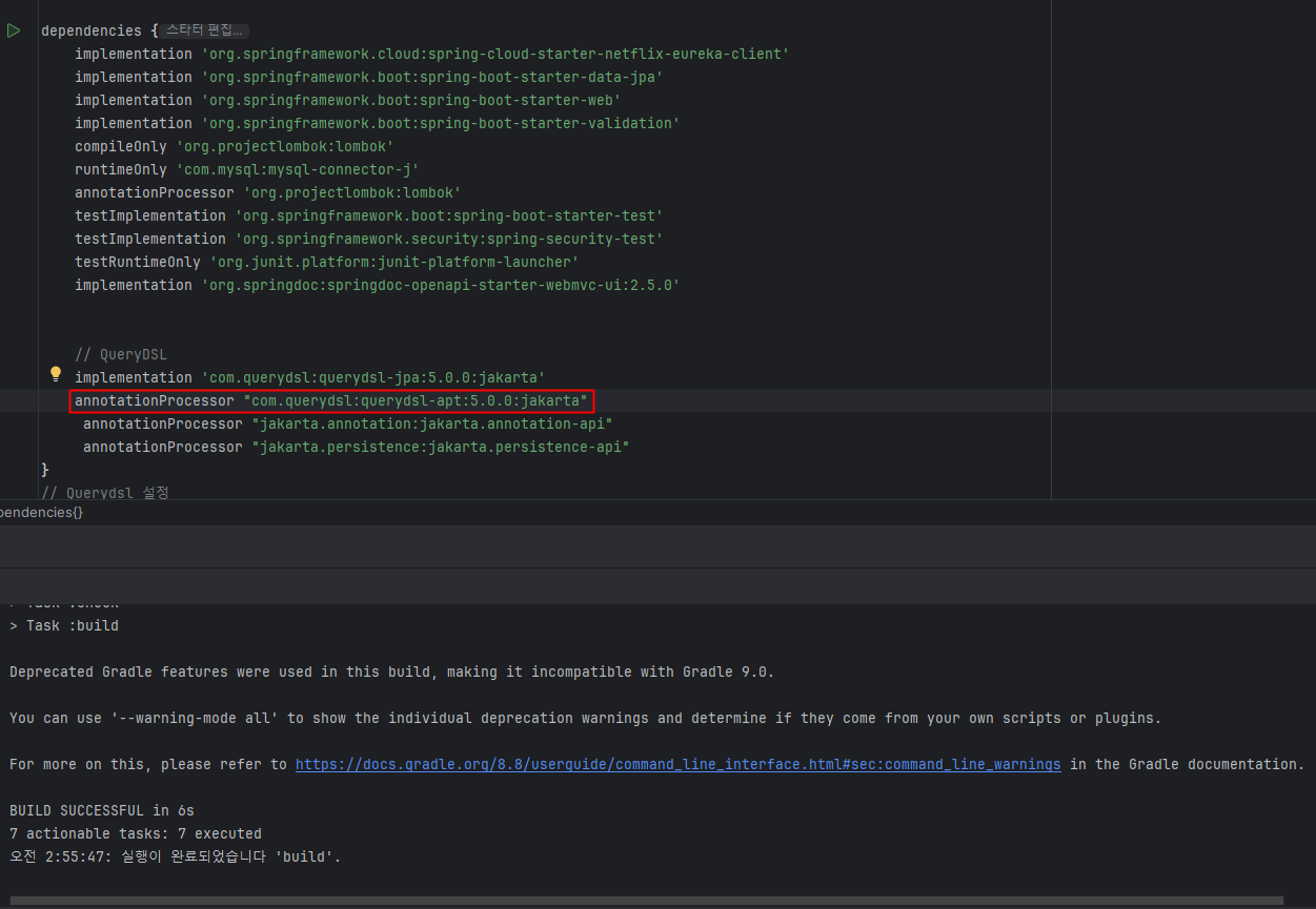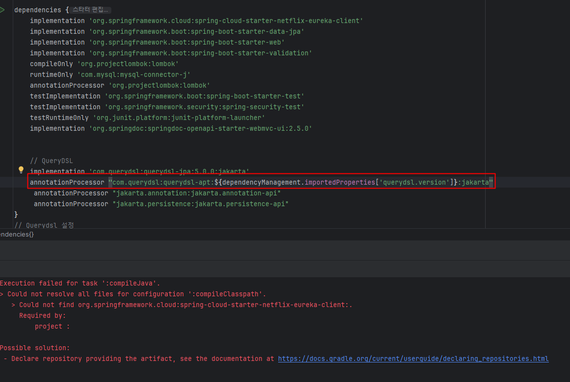 문제가 되는 의존성을 찾아내기 위해 하나하나 주석 처리해가면서 빌드해 본 결과 queryDSL 의존성에서 문제가 발생한다는 것을 알아냈다.
