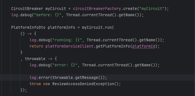 그리고 CircuitBreakerFactory 를 주입받아서 위와 같이 호출하는 코드를 작성해두었다.