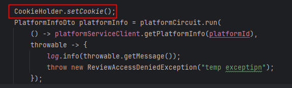 이것은 FeignClient 를 호출하기 전에 현재 쓰레드의 Cookie 값을 받아와서 전달하는 역할을 하는 코드이다.