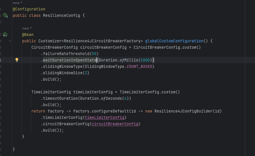 Gradle implementation "org.springframework.cloud:spring-cloud-starter-circuitbreaker-reactor-resilience4j" implementation 'org.springframework.boot:spring-boot-starter-actuator' CircuitBreaker Configuration 빈 등록 @Bean public Customizer defaultCustomi