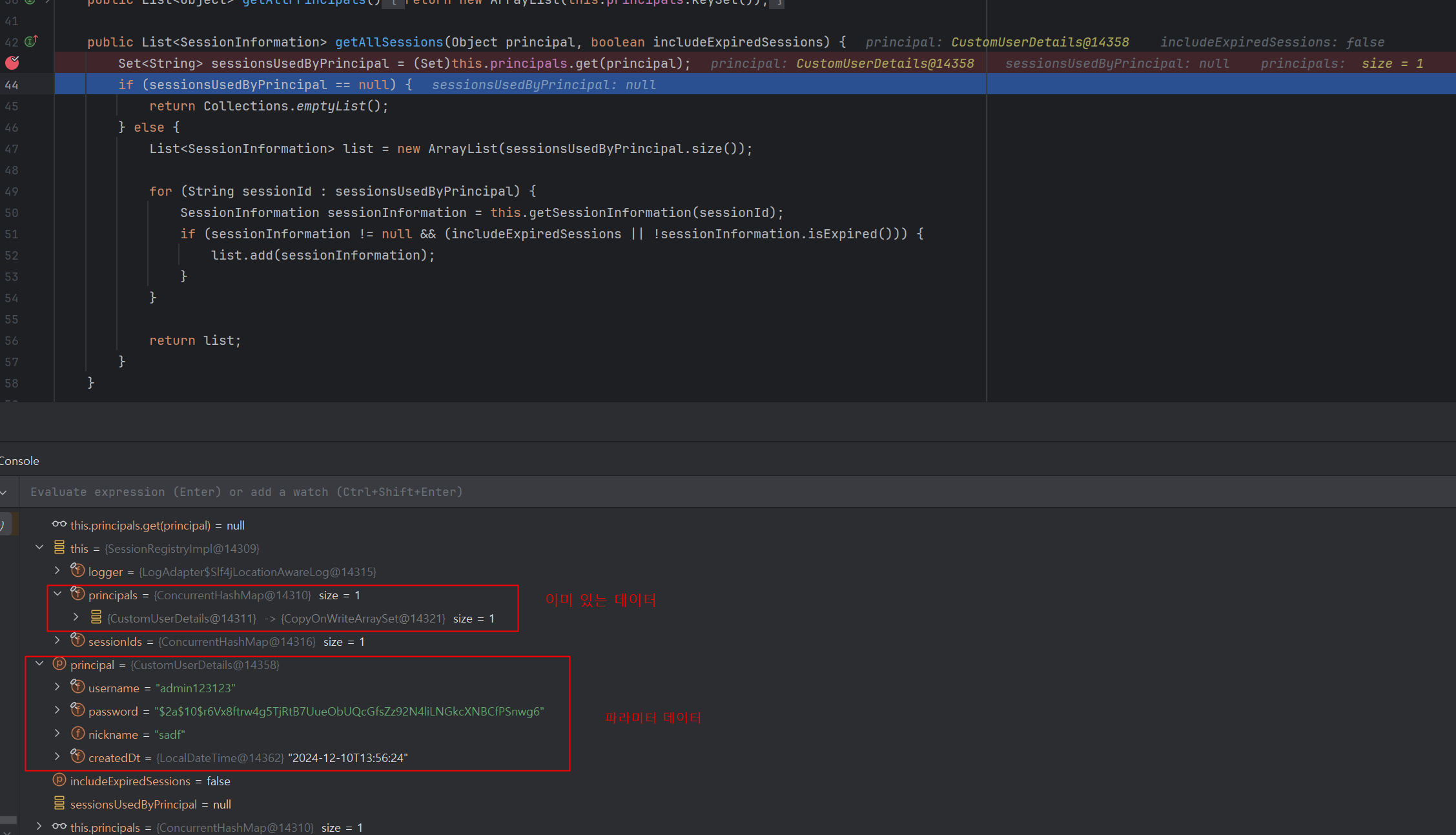 여기서 principals 라는 객체는 ConcurrentHashMap 자료 구조를 사용하고 있었는데, get 을 이용해도 그것과 유사한 객체를 가져오지 못하는 이유는 내가 추가했던 CustomUserDetails 클래스에서 equals() 와 hashCode() 메서드를 오버라이딩 하지 않았기 때문이였다.